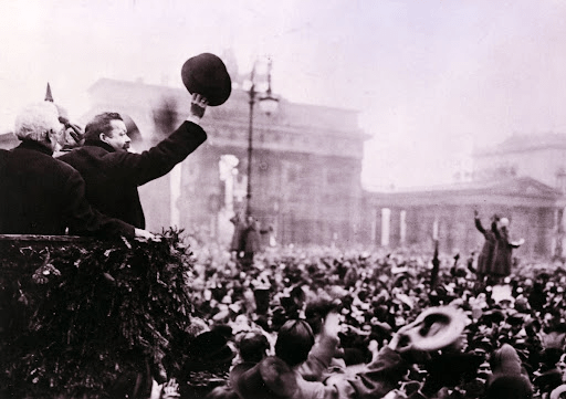 ฟรีดริค เอแบร์ท บนจัตุรัสหน้าประตูบรันเดนบูร์ก ระหว่างการปฏิวัติเดือนพฤศจิกายน 1918